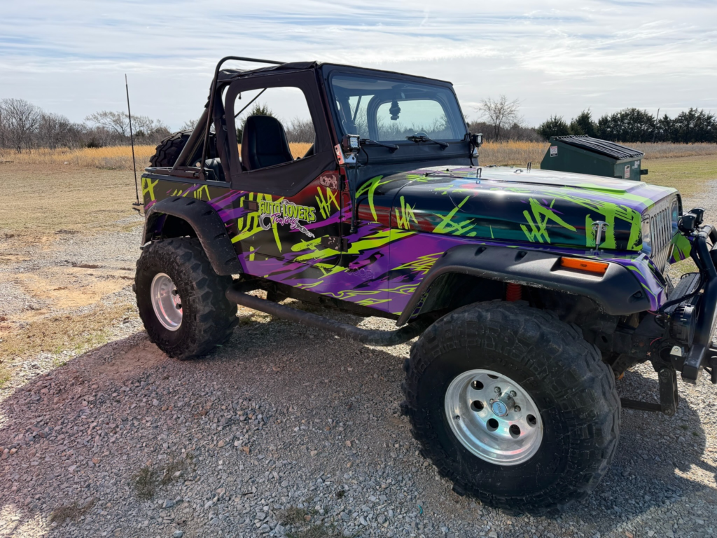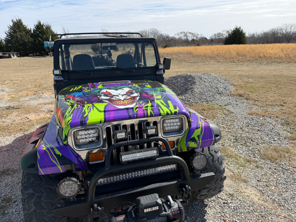 From the aggressive purple and green color scheme to the custom character artwork on the hood, this wrap was designed to stand out in a crowd. Whether it’s parked at an event, cruising through town, or sitting at a job site, this Jeep demands attention.