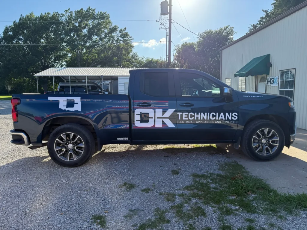 HGX recently completed a striking decal and tailgate wrap package for OK Technicians, an electrical, appliance, and controls service provider. Their patriotic logo pops on both sides of the truck, and the tailgate now features a full-wrap American flag background for a bold finishing touch.